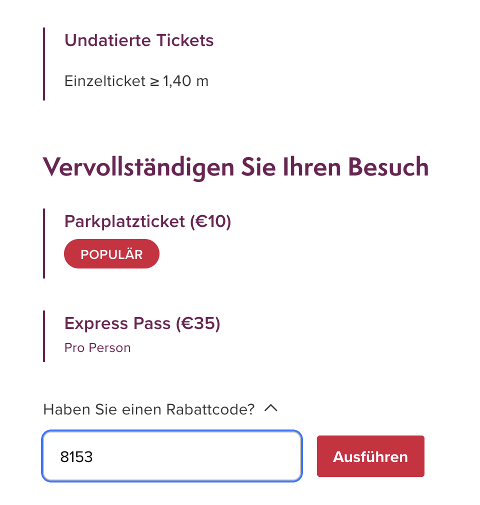 Hinweis zu Gutscheinen/Promocodes direkt auf der Holiday Park Website – so einfach könnt ihr die Tickets bestellen.