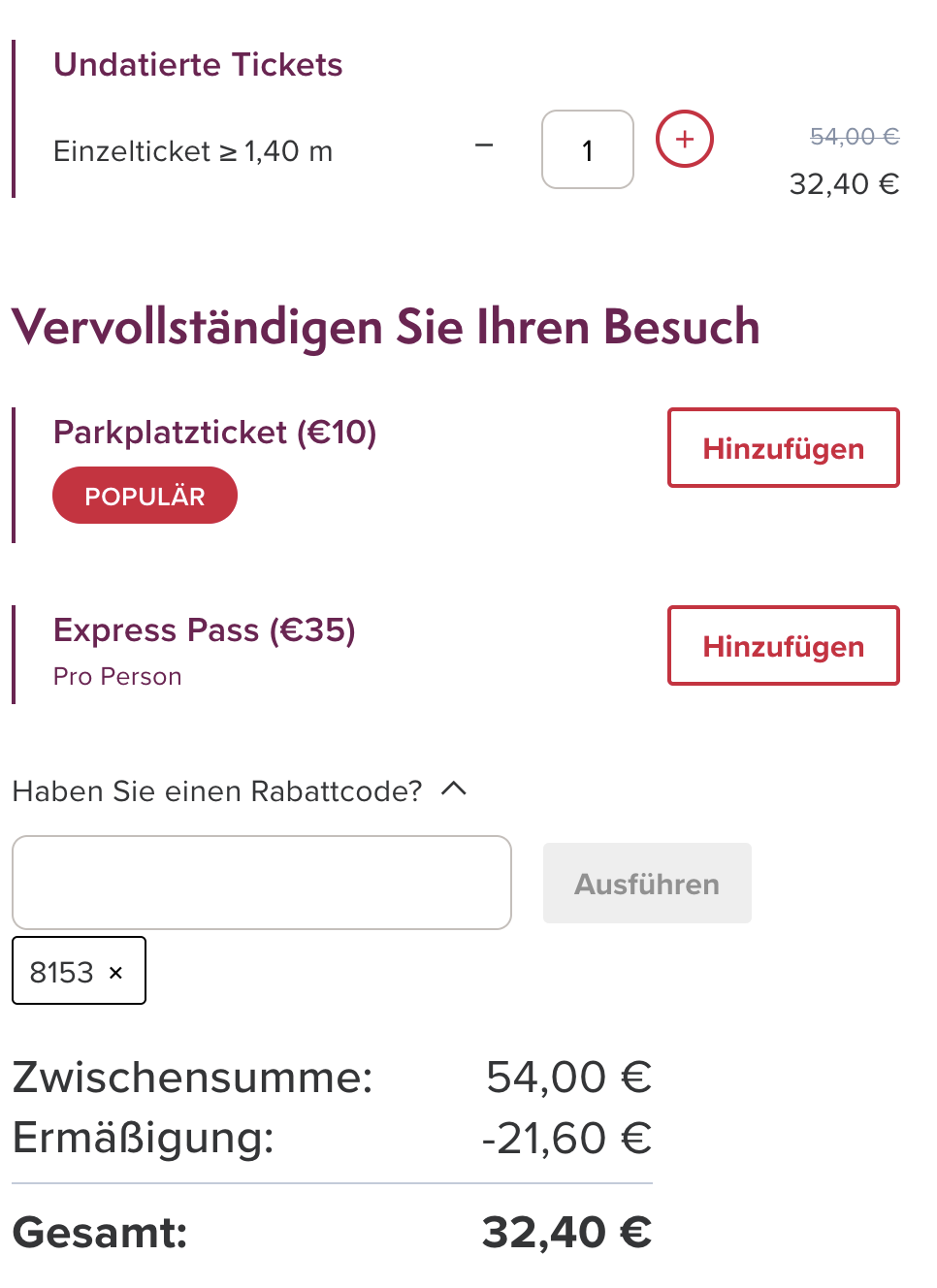 - Der rabattierte Preis wird nun angezeigt und ihr könnt bestellen. Die Tickets kommen kurz danach als PDF per E-Mail!